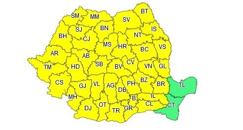 Avertizarea meteo este valabilă în aproape toată țara, excepție făcând județele Tulcea și Constanța.