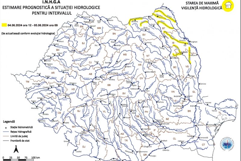 Potrivit hidrologilor, este cod galben, în intervalul 04.06.2024 ora 12:00 – 05.06.2024 ora 09:00 pe râurile din bazinele hidrografice: Suceava – bazin superior şi afluenţi bazin mijlociu şi inferior (judeţul Suceava), Bârlad – bazin amonte S.H. Negreşti şi afluenţii aferenţi sectorului aval S.H. Negreşti – amonte S.H. Bârlad (judeţele: Neamţ, Iaşi şi Vaslui), Jijia – bazin superior şi afluenţi bazin mijlociu şi inferior, Prut – afluenţii aferenţi sectorului amonte confluenţă cu râul Jijia (judeţele: Botoşani şi Iaşi).