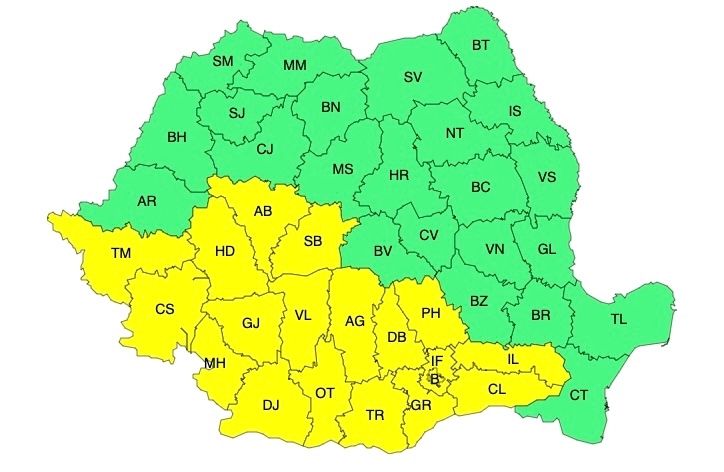 Administrația Națională de Meteorologie a emis atenționări cod portocaliu de caniculă, dar și cod galben de instabilitate atmosferică accentuată.
