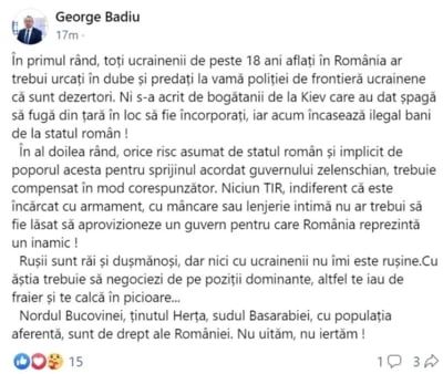 Un deputat AUR a avut în aceste zile un derapaj major la adresa refugiaților ucraineni. George Badiu a declarat că toți ucrainenii de peste 18 ani din România ar trebui să fie „urcați în dube” și trimiși înapoi în țara lor.