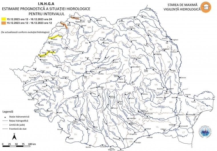 În intervalul 15.12.2023 ora 12:00 – 16.12.2023 ora 24:00 pe râurile din bazinele hidrografice: Tur – sector aval Ac. Cӑlineşti Oaş (judeţul Satu Mare), Crasna – sector aval S.H. Craidorolţ (judeţul Satu Mare), Barcău – sector aval S.H. Balc (judeţul Bihor), Crişul Negru – sector aval confluenţă cu râul Holod, Holod – curs inferior (judeţele: Bihor şi Arad).