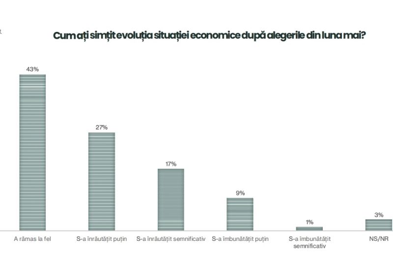 Cât despre situația economică după alegerile din luna mai, 43% dintre români spun că aceasta a rămas la fel. Doar 1% susțin că s-a îmbunătățit semnificativ.