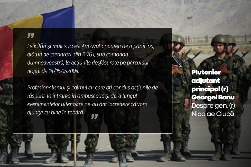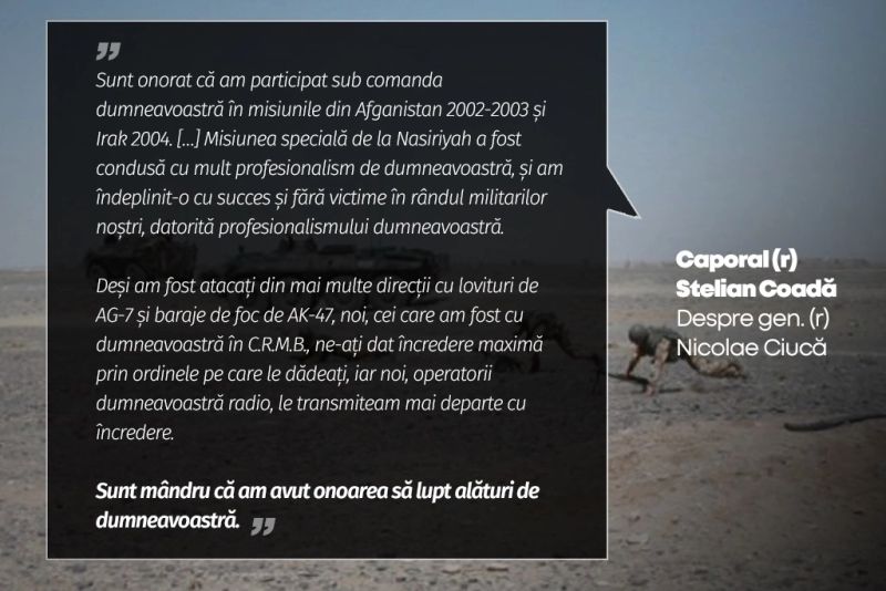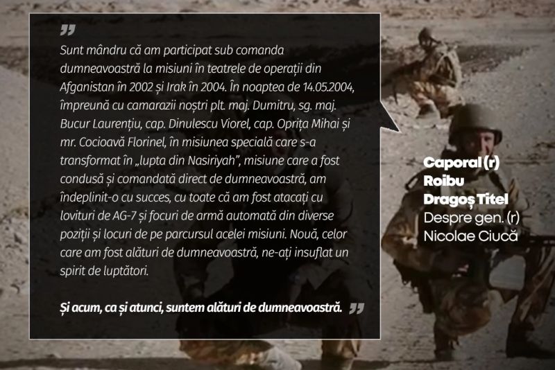 „Am onoarea să vă salut Domnule General! Sunt caporal în rezervă Roibu Dragoș Titel, și sunt mândru că am participat sub comanda dumneavoastră la misiuni în teatrele de operații din Afganistan în 2002 și 2004 Irak. In noaptea de 14.05.2004 împreună cu camarazii noștri Plt. maj. Dumitru, Sg. maj. Bucur Laurențiu, cap. Dinulescu Viorel (Dumnezeu să-l odihnească), Cap. Oprita Mihai și Mr. Cocioava Florinel, în misiunea specială care s-a transformat în "lupta din Nasiria", misiune care a fost condusă și comandată direct de dumneavoastră am îndeplinit-o cu succes cu toate că am fost atacați cu lovituri de AG 7 și focuri de armă automată în diverse poziții și locuri de pe parcursul acelei misiuni. Nouă celor care am fost alături de dumneavoastră ne-ați insuflat un spirit de luptători. Și acum ca și atunci suntem alături de dumneavoastră la noua provocare și împreună vom ieșim victorioși! Mult succes! Doamne ajută!”, scrie unul dintre vechii camarazi de arme ai generalului în rezervă Nicolae Ciucă, actual președinte al PNL și candidat la funcția de președinte al României.