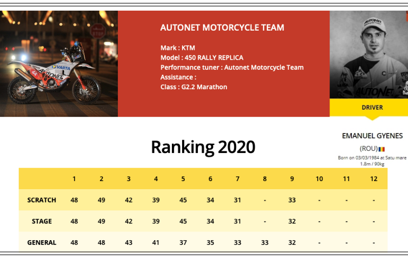 Rezultatele înregistrate de Mani Gyenes la #Dakar2020:Etapa 1 (5 ianuarie): Jeddah – Al Wajh: locul 48/general 48;Etapa 2 (6 ianuarie): Al Wajh – Neom: locul 49/general 48;Etapa 3 (7 ianuarie): Neom – Neom: locul 42/general 43;Etapa 4 (8 ianuarie): Neom – Al-‘Ula: locul 39/general 41;Etapa 5 (9 ianuarie): Al-‘Ula – Ha’il: locul 44/general 37;Etapa 6 (10 ianuarie): Ha’il – Riyadh: locul 34/general 35;11 ianuarie – zi de odihnă;Etapa 7 (12 ianuarie): Riyadh – Wadi A Dawasir: locul 31/general 33;Etapa 8 (13 ianuarie): Wadi Al Dawasir – Wadi Al Dawsir;Etapa 9 (14 ianuarie): Wadi Al Dawasir – Haradh: locul 32/general 32;